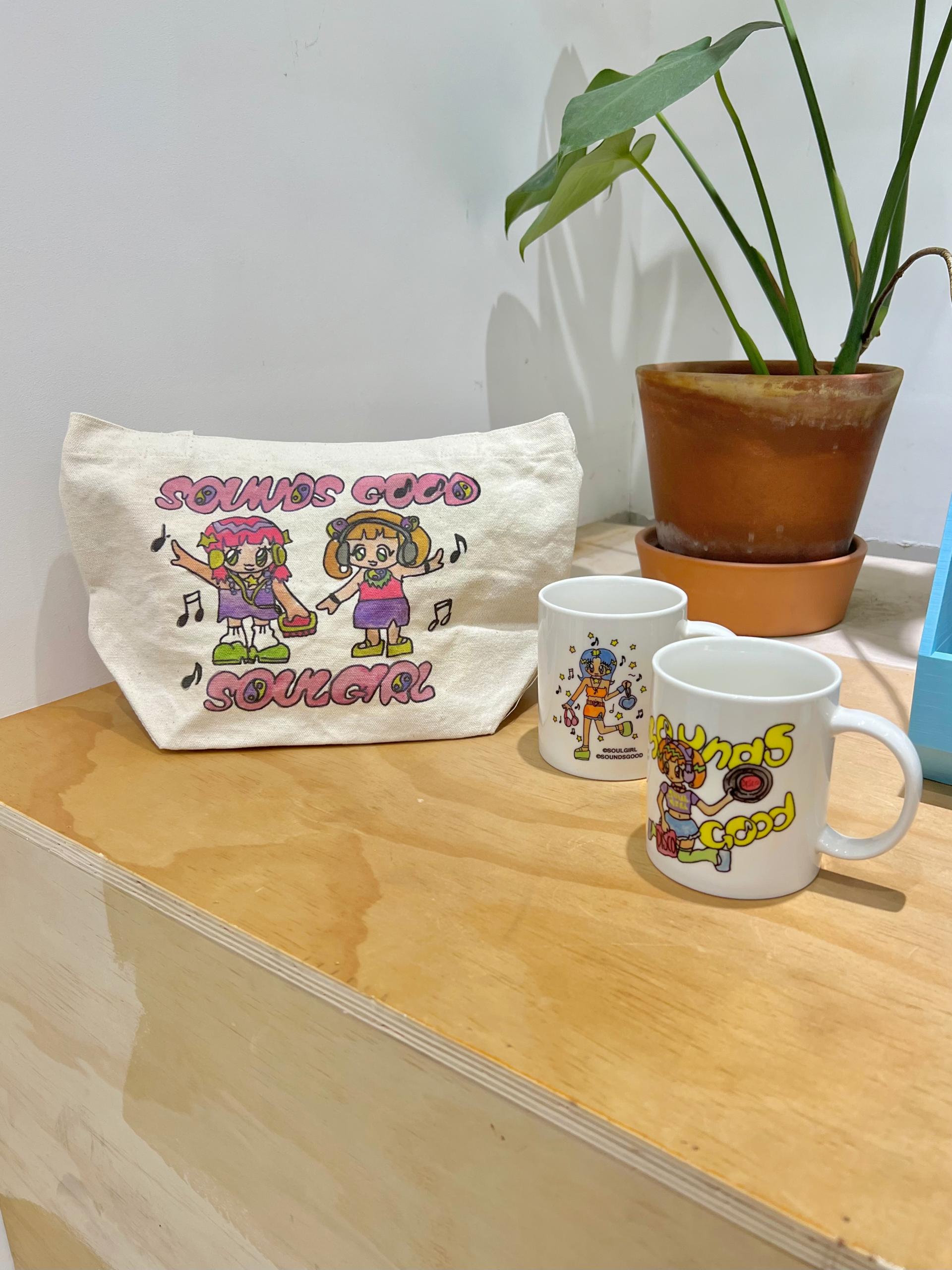 빈티지 셀렉트숍 ‘SOULPUSSSYCAT’과 SOUNDSGOOD의 협업 머천다이즈. 소울푸시캣의 디렉터 키티리(@so_ul_amazing_)가 직접 그린SOULGIRL 캐릭터가 프린팅된 미니백(토트백).